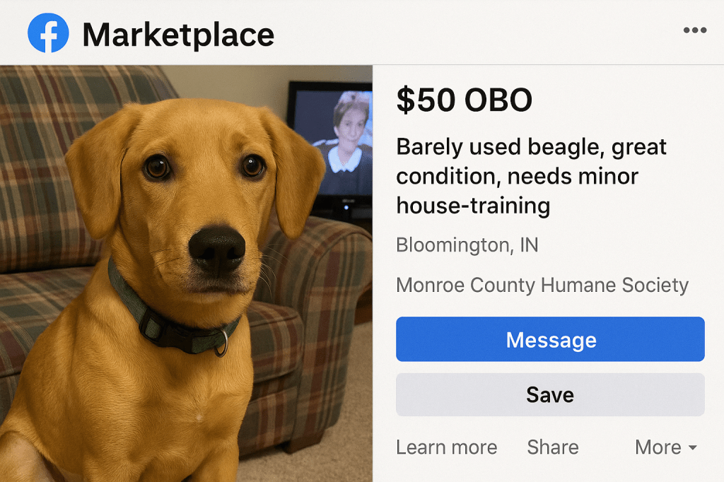 BLOOMINGTON, IN – In a bold cost-cutting move, the Monroe County Humane Society announced this week that all future adoptions will be processed through Facebook Marketplace.